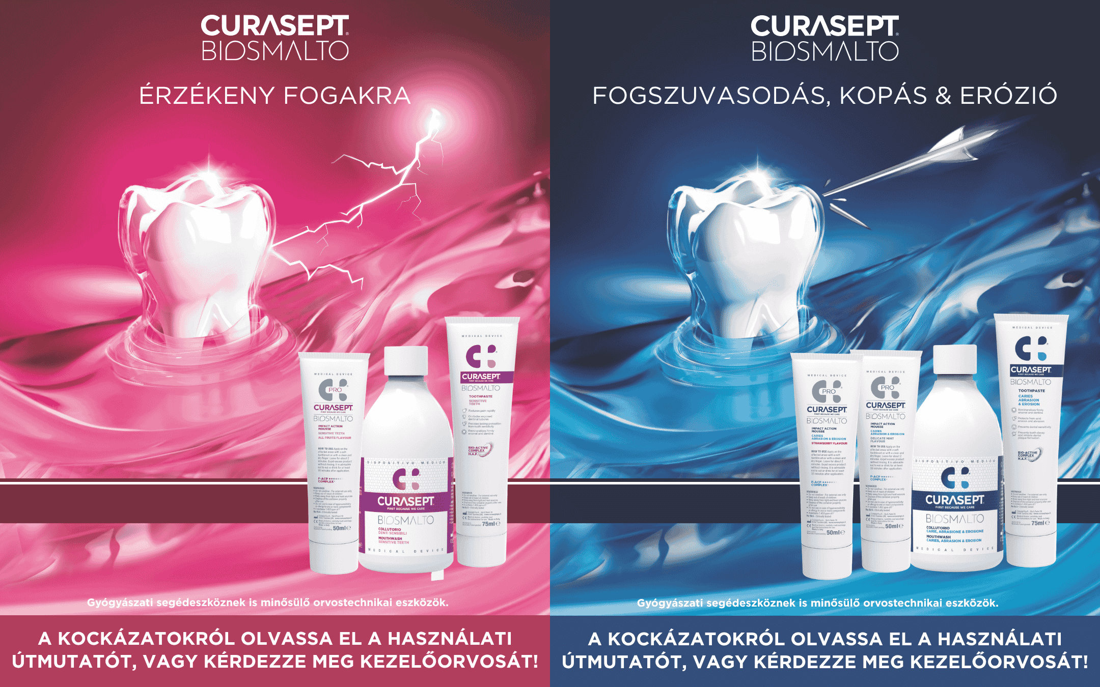 A Curasept Biosmalto készítmények fogérzékenység, valamint fogszuvasodás, erózió, abrázió esetén alkalmazhatók.